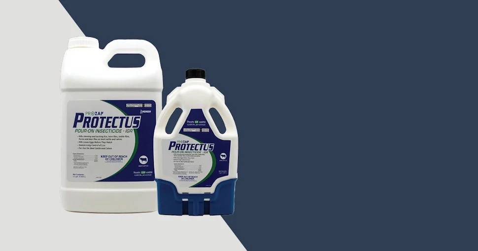 Prozap Protectus Pour-On Insecticide – IGR is a ready-to-use triple-active formula for use on beef cattle and calves that kills chewing and sucking lice, horn flies, stable flies, horse and deer flies. The product is formulated with a unique combination of active ingredients, including an insect growth regulator (IGR), adulticide, and a synergist, which provides cattle with relief from infestations and kills louse eggs before they hatch, providing season-long control of lice in one application.
